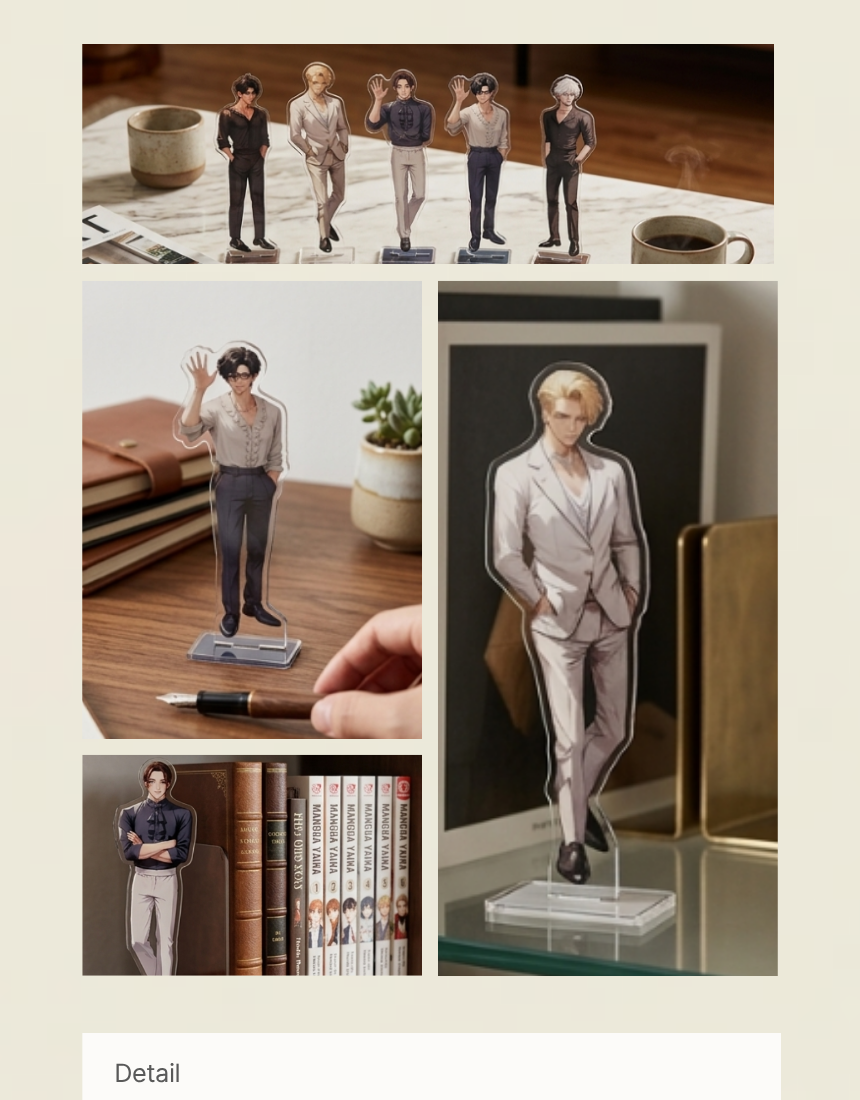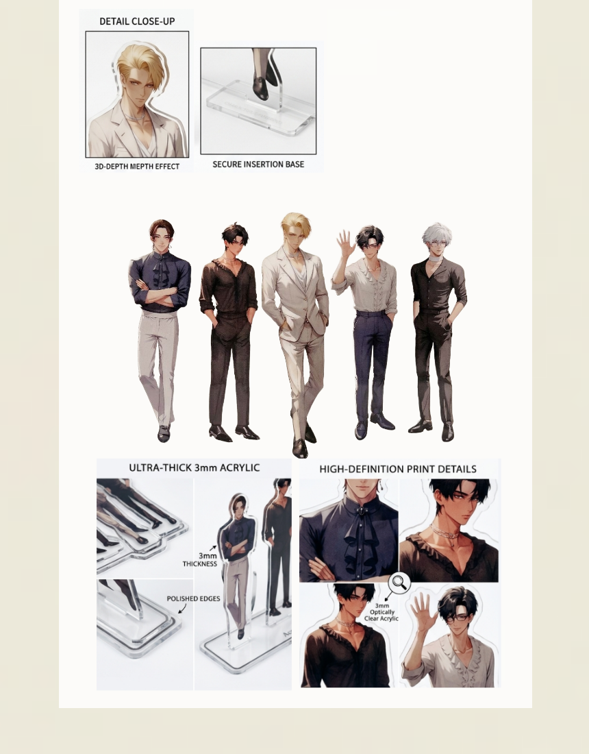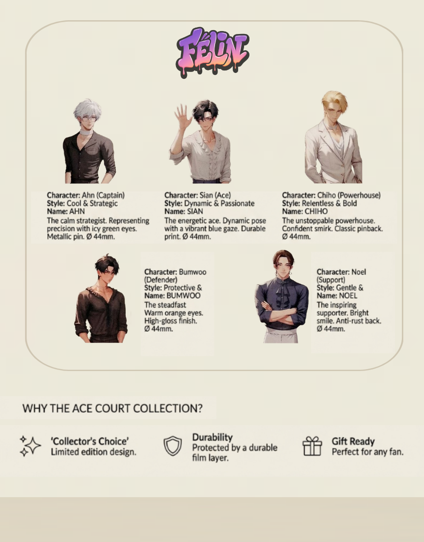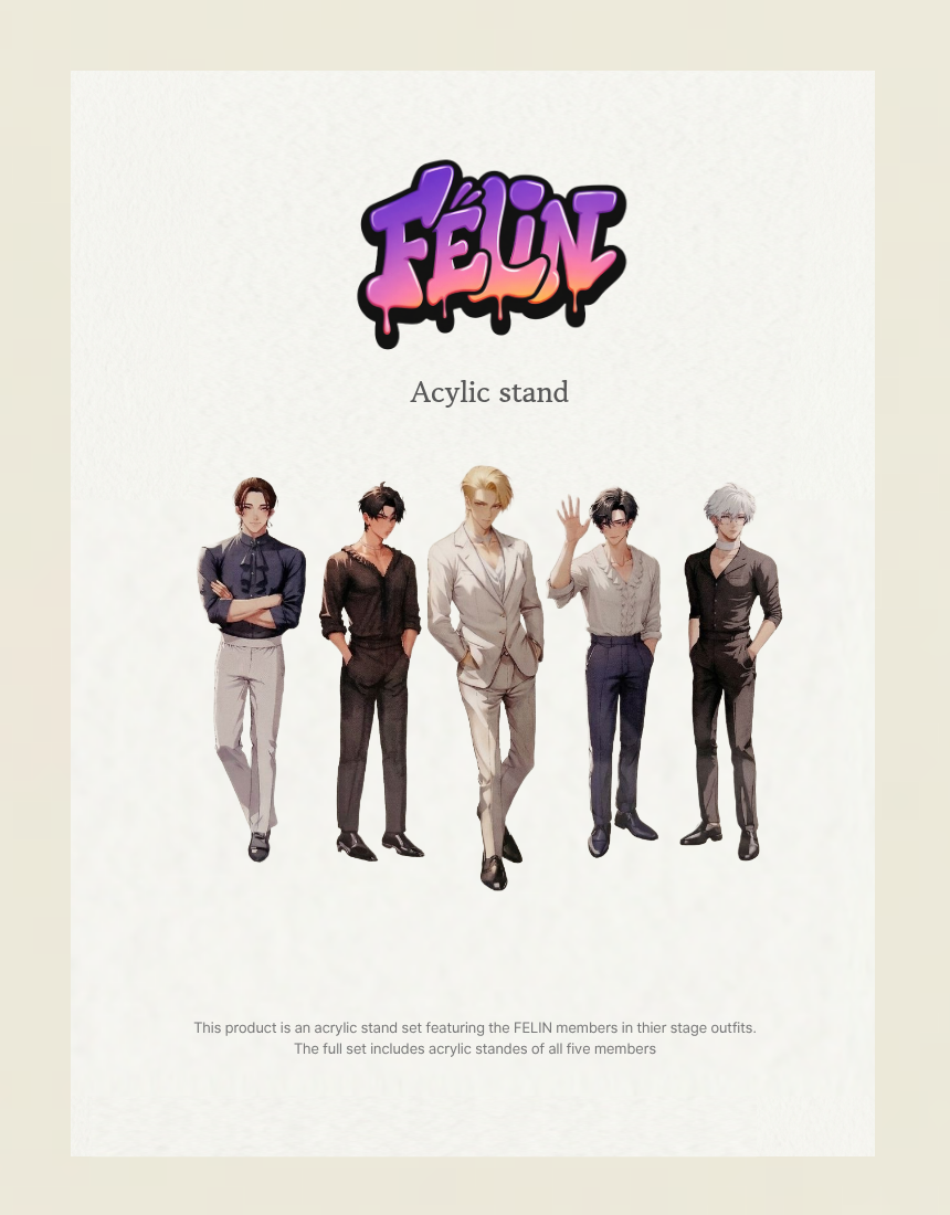 This product is an acrylic stand set featuring the FELIN members in their stage outfits. The full set includes acrylic standees of all five members.
